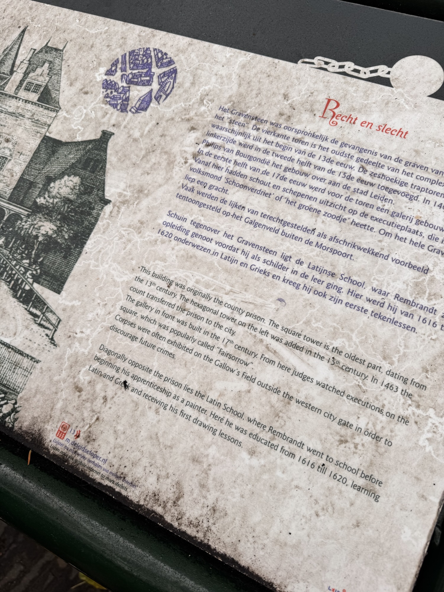 Bij Escape Room Leiden ontdekten we meer geheimen van de meester (en kwamen we er ternauwernood op tijd uit). Via de VVV haalden we de Rembrandtroute, een wandelroute langs alle plekken die met zijn leven verbonden zijn. Een unieke tocht vol verhalen en anekdotes over de jonge schilder die hier in 1606 werd geboren.