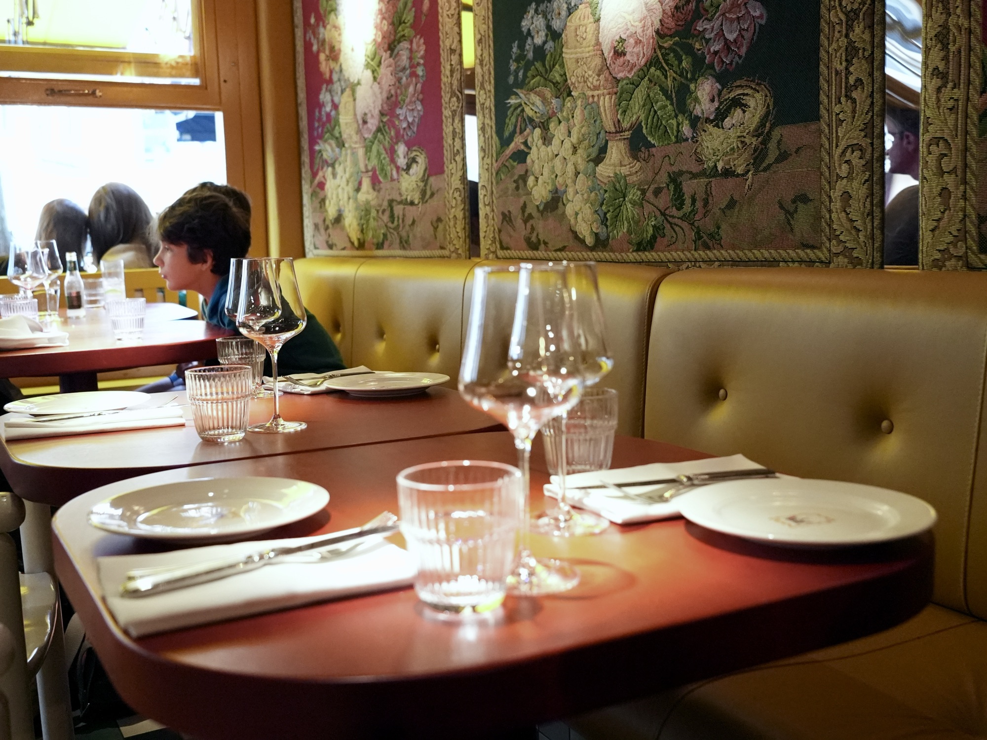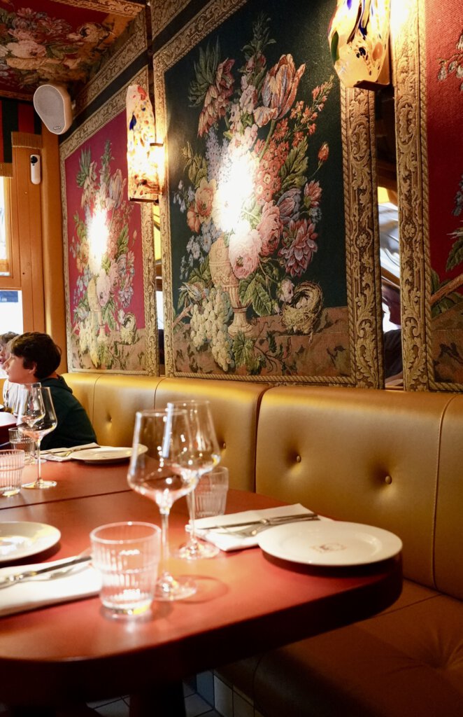 Wanden en plafonds zijn rijk bekleed met stoffen vol florale prints, met royale banieren boven de tafels die zorgen voor een intieme sfeer. Het voelt als interieur couture, maar dan eentje waar je gewoon urenlang in wilt blijven zitten. Elk detail klopt.
